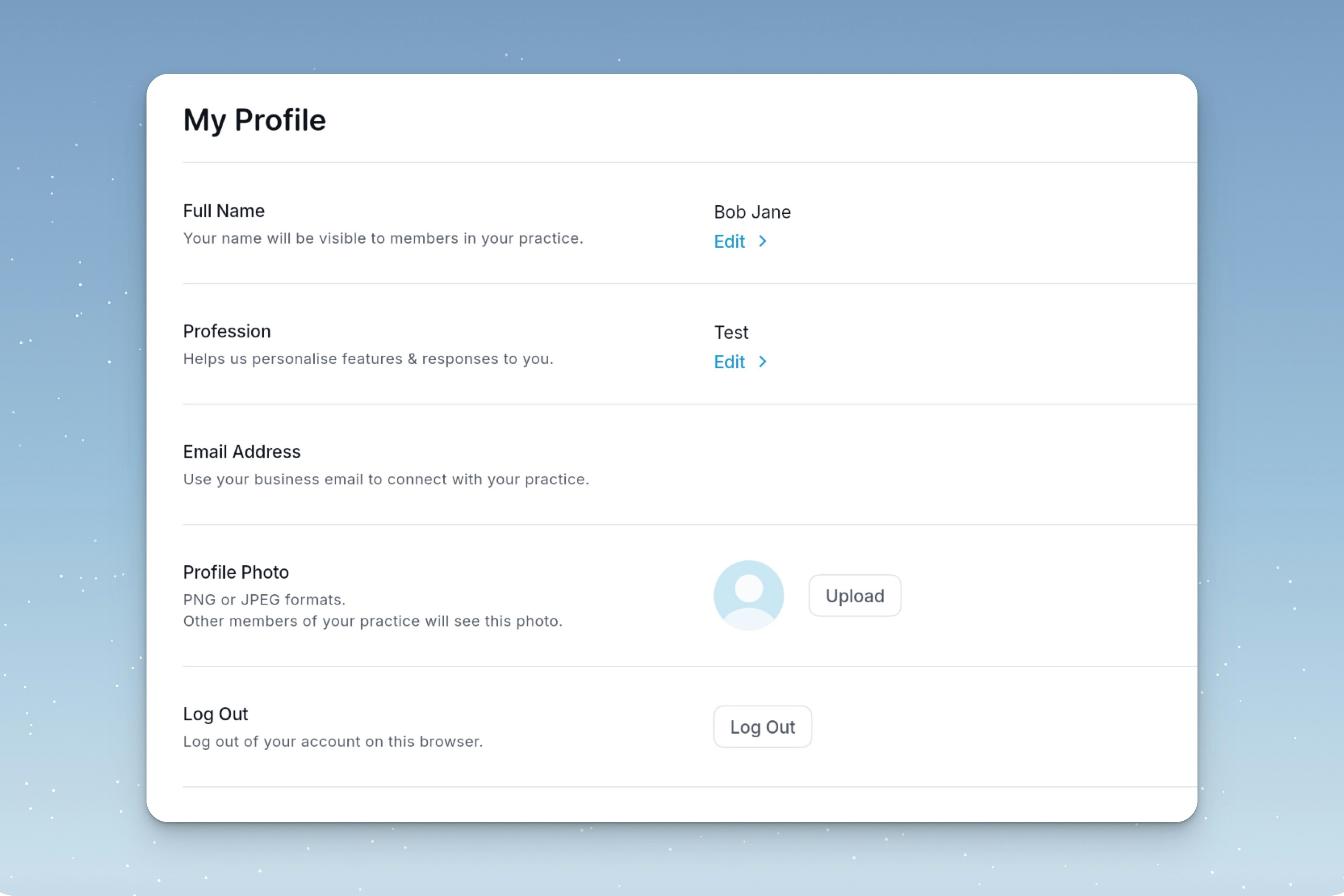 - Profile Photo: This will only be visible to you. If you are part of a practice, this will be visible to the practice owner.